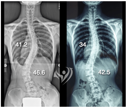 在治療結束前夕,她的胸椎側彎及腰椎側彎度數均獲得改善,胸椎側彎由62.5度降到55度、腰椎側彎則由45.5度變為37度。